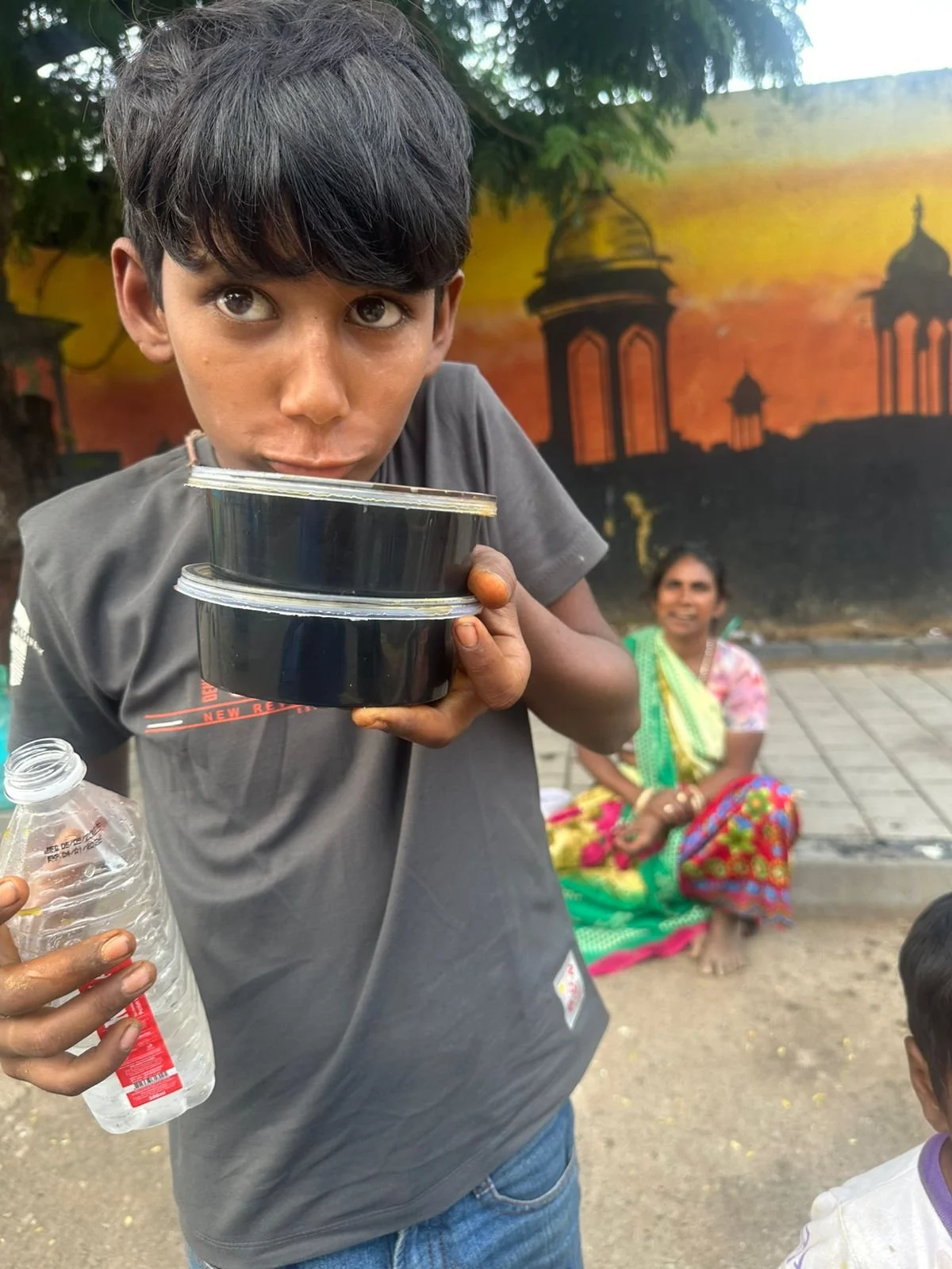 A boy holding food containers close, smiling shyly — his gesture says it all. For him, this meal is more than food